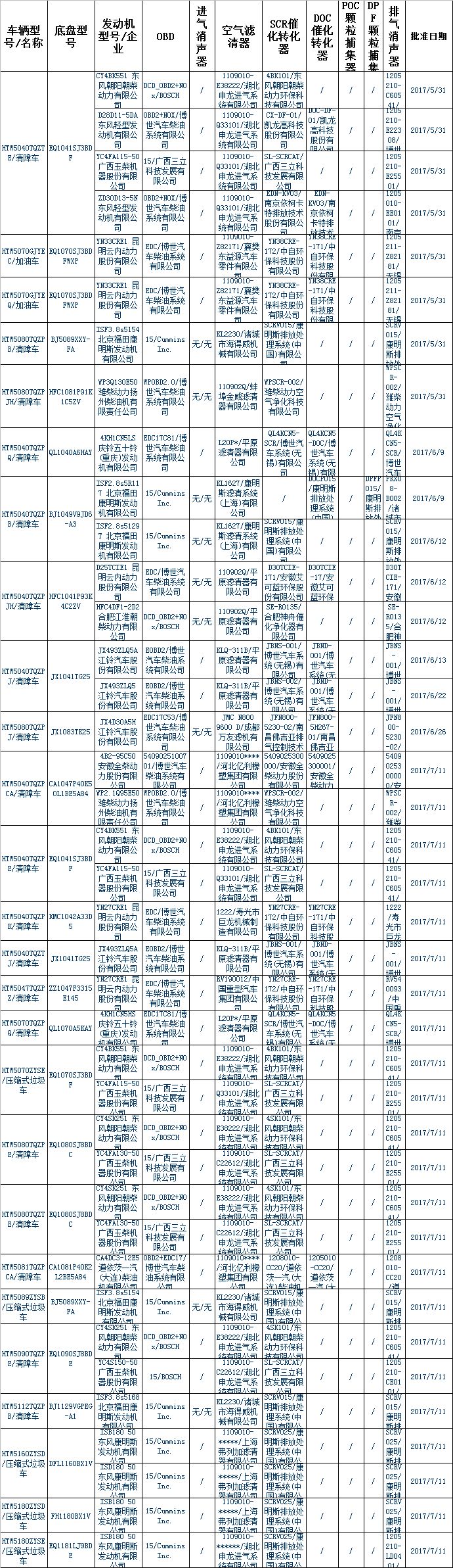 | WP2.1Q95E50 濰柴動(dòng)力揚(yáng)州柴油機(jī)有限責(zé)任公司 | WPOBD2.0/博世汽車柴油系統(tǒng)有限公司 | / | 1109010****/河北億利橡塑集團(tuán)有限公司 | WPSCR-002/濰柴動(dòng)力空氣凈化科技有限公司 | / | / | / | WPSCR-002/濰柴動(dòng)力空氣凈化科技有限公司 | 2017/7/11 | ||