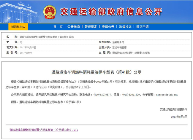 根據(jù)《道路運輸車輛燃料消耗量檢測和監(jiān)督管理辦法》(交通運輸部令2009年第11號)有關(guān)規(guī)定,現(xiàn)對通過技術(shù)審查的《道路運輸車輛燃料消耗量達標(biāo)車型表(第41批)》進行公示(詳見附件),公示期為5個工作日。其中包括湖北同威汽車配件有限公司的5款車型,分別為HTW5040TQZPQ清障車,HTW5080TQZPJH清障車,HTW5110GJYEQ加油車,HTW5111GJYQ加油車,HTW5127GJYEQ加油車,具體公示內(nèi)容請看下表。