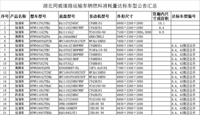 湖北同威道路運輸車輛燃料消耗量達(dá)標(biāo)車型公告匯總