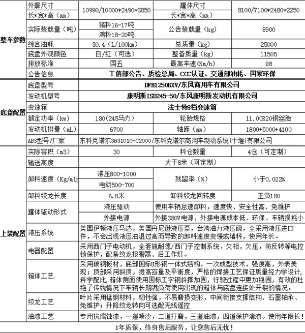 | 罐體外形尺寸:8000×2450×2250(mm),罐體有效容積:27.93立方米隨底盤選裝駕駛室;外形長(mm)/軸距(mm)/后懸(mm)/離去角(°)對應(yīng)關(guān)系為”:10990/1800+5000/2760/11,10000/1800+4100/2670/12;防護(hù)材料:Q235,連接方式:側(cè)后防護(hù)均采用焊接連接,后部防護(hù)斷面尺寸(mm):120×60,后部防護(hù)離地高度(mm):450。安裝帶衛(wèi)星定位功能的行駛記錄儀。ABS生產(chǎn)廠家:東科克諾爾商用車制動(dòng)系統(tǒng)(十堰)有限公司;型號:3631010-C2000.;發(fā)動(dòng)機(jī)與油耗值的對應(yīng)關(guān)系分別為:ISD210 50/33.7(L/100Km),ISD245 50/33.6(L/100Km),ISD210 50/33.7(L/100Km),ISD270 50/33.6(L/100Km),ISD285 50/33.5(L/100Km)。該車專用裝置為絞龍,飼料倉,用于運(yùn)輸散裝飼料,自卸方式:絞龍?zhí)嵘孕。選裝后部樣式。 |